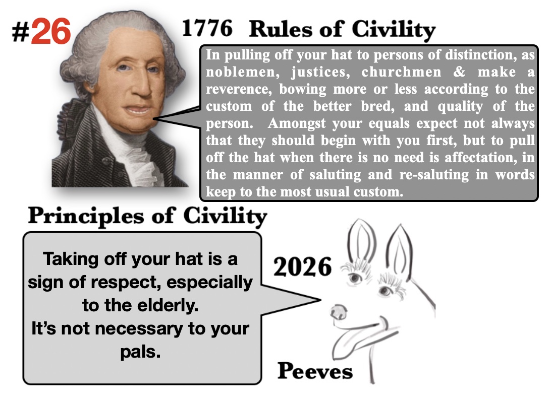 In pulling off your hat to persons of distinction, as noblemen, justices, churchmen &c make a reverence, bowing more or less according to the custom of the better bred, and quality of the person.  Amongst your equals expect not always that they should begin with you first, but to pull off the hat when there is no need is affectation, in the manner of saluting and re-saluting in words keep to the most usual custom.